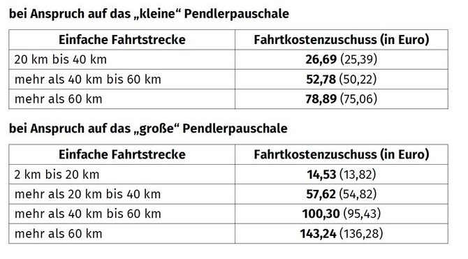 Ab 1. August 2025 beträgt der Fahrtkostenzuschuss für jeden vollen Kalendermonat (in Klammer die bisherigen Beträge):